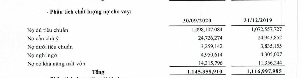 Tại ngày 30/9/2020, trong khi cho vay khách hàng tăng nhẹ 3%, ghi nhận gần 1.15 triệu tỷ đồng thì tổng nợ xấu đã tăng tới 16% so với đầu năm, ở mức hơn 22.525 tỷ đồng do nợ nghi ngờ tăng 15% đạt gần 4.951 tỷ đồng và nợ có khả năng mất vốn tăng 16% đạt gần 14.316 tỷ đồng. Kết quả kéo tỷ lệ nợ xấu trên dư nợ vay tăng từ mức 1,75% đầu năm lên 1,97%.