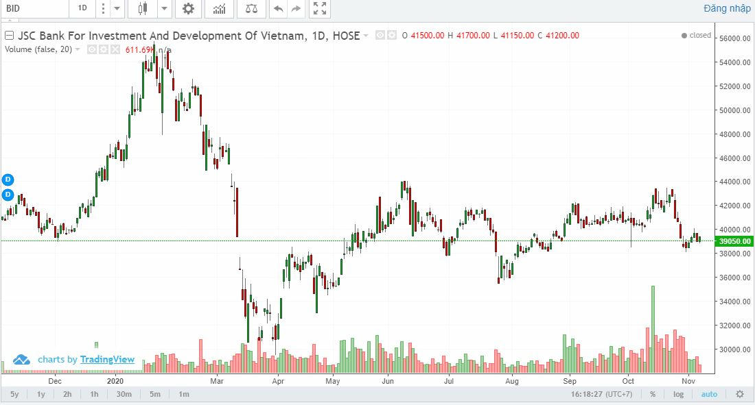 Trên thị trường, khép phiên giao dịch ngày 6/11 giá cổ phiếu BID hiện đang giao dịch ở mức 39.050 đồng/cp, giảm 3% qua 1 tháng trở lại đây với khối lượng giao dịch bình quân hơn 1 triệu cp/phiên.