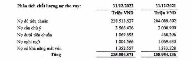 Theo đó, tổng nợ xấu tính đến 31/12/2022 tăng 20% so với đầu năm, chiếm 3.427 tỷ đồng trong tổng dư nợ. Trong đó, nợ dưới tiêu chuẩn (nợ nhóm 3) tăng mạnh nhất, từ 460 tỷ đồng hồi đầu năm lên gần 1.070 tỷ đồng. Kết quả, đẩy tỷ lệ nợ xấu trên dư nợ vay tăng từ mức 1,37% đầu năm lên 1,46%.