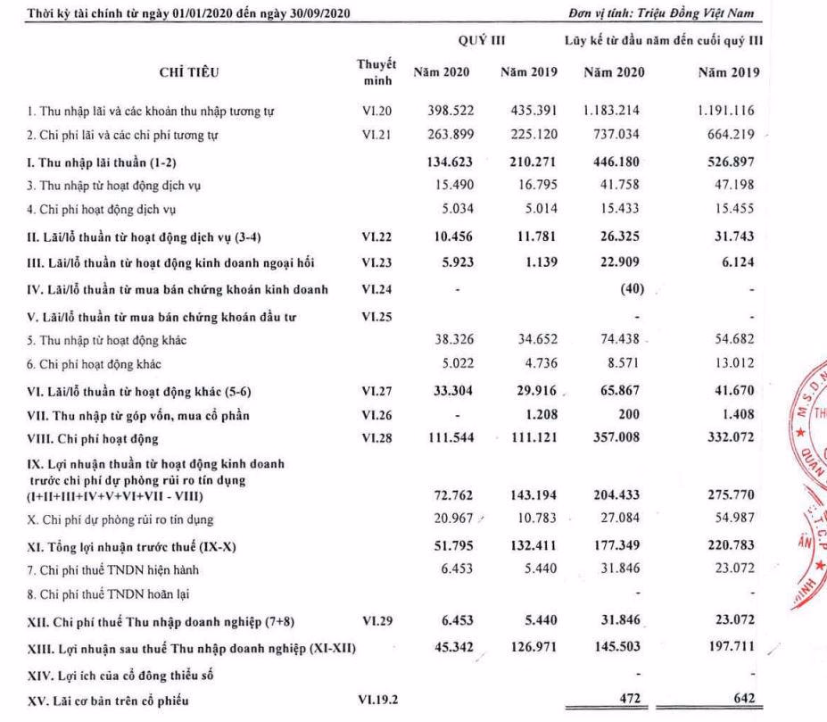 Do lãi thuần từ hoạt động kinh doanh giảm 8%, còn hơn 929 tỷ đồng trong khi chi phí dự phòng rủi ro tín dụng tăng 49% lên hơn 282 tỷ đồng. Kết quả, lợi nhuận trước và sau thuế quý 3/2020 cùng giảm 22% so với cùng kỳ, chỉ còn hơn 647 tỷ đồng và hơn 517 tỷ đồng.