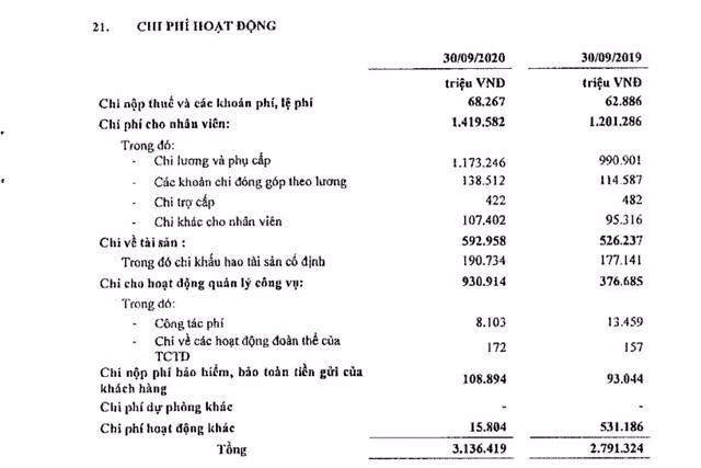 Theo đó, trong 9 tháng đầu năm, chi phí hoạt động của LienVietPostBank còn tăng nhiều hơn lợi nhuận sau thuế, đạt hơn 3.136 tỷ đồng, tăng 12% so với cùng kỳ 2019.