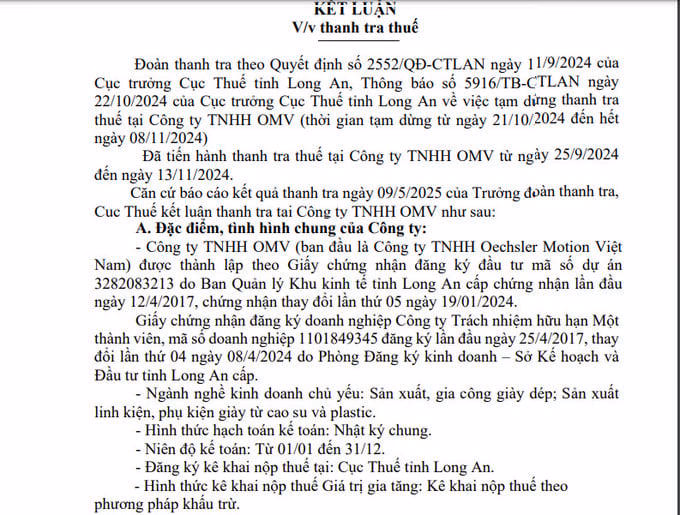 Chi cục Thuế khu vực XVII (Long An) vừa công bố kết luận thanh tra thuế tại Công ty TNHH OMV, với thời gian thanh tra từ ngày 25/9/2024 đến ngày 13/11/2024.
