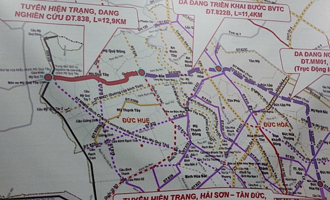 Đường tỉnh 838 sẽ được mở rộng quy mô hoàn thiện 6 làn xe, có chiều dài 13km kết nối vùng tính từ cửa khẩu Mỹ Quý Tây, huyện Đức Huệ, tỉnh Long An đến đường Võ Văn Kiệt (TP Hồ Chí Minh).