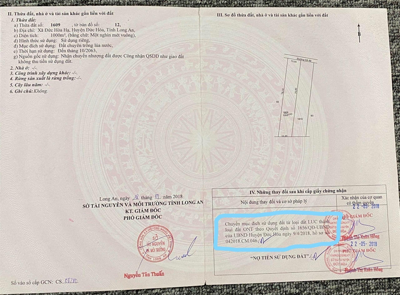 Ngày 22/5/2010, Văn phòng đăng ký đất đai huyện Đức Hòa chấp nhận cho chuyển đổi mục đích sử dụng của thửa đất từ đất trồng lúa sang đất ở. Tuy nhiên, đến ngày 22/5/2019, cơ quan này xác nhận thửa đất vẫn còn ghi nợ tiền sử dụng đất.