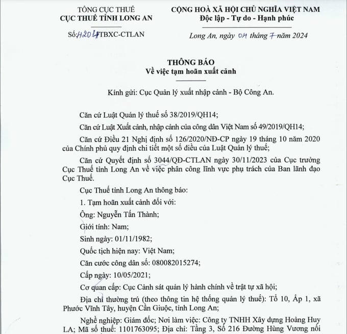 Lý do tạm hoãn xuất cảnh được đưa ra là vì ông Thành là người đại diện theo pháp luật của Công ty TNHH Xây dựng Hoàng Huy LA, công ty này còn nợ ngân sách nhà nước theo Thông báo tiền thuế nợ số 26894/TB-CTLAN-KĐT ngày 11/6/2024 của Cục thuế tỉnh Long An hơn 8,42 tỉ đồng.