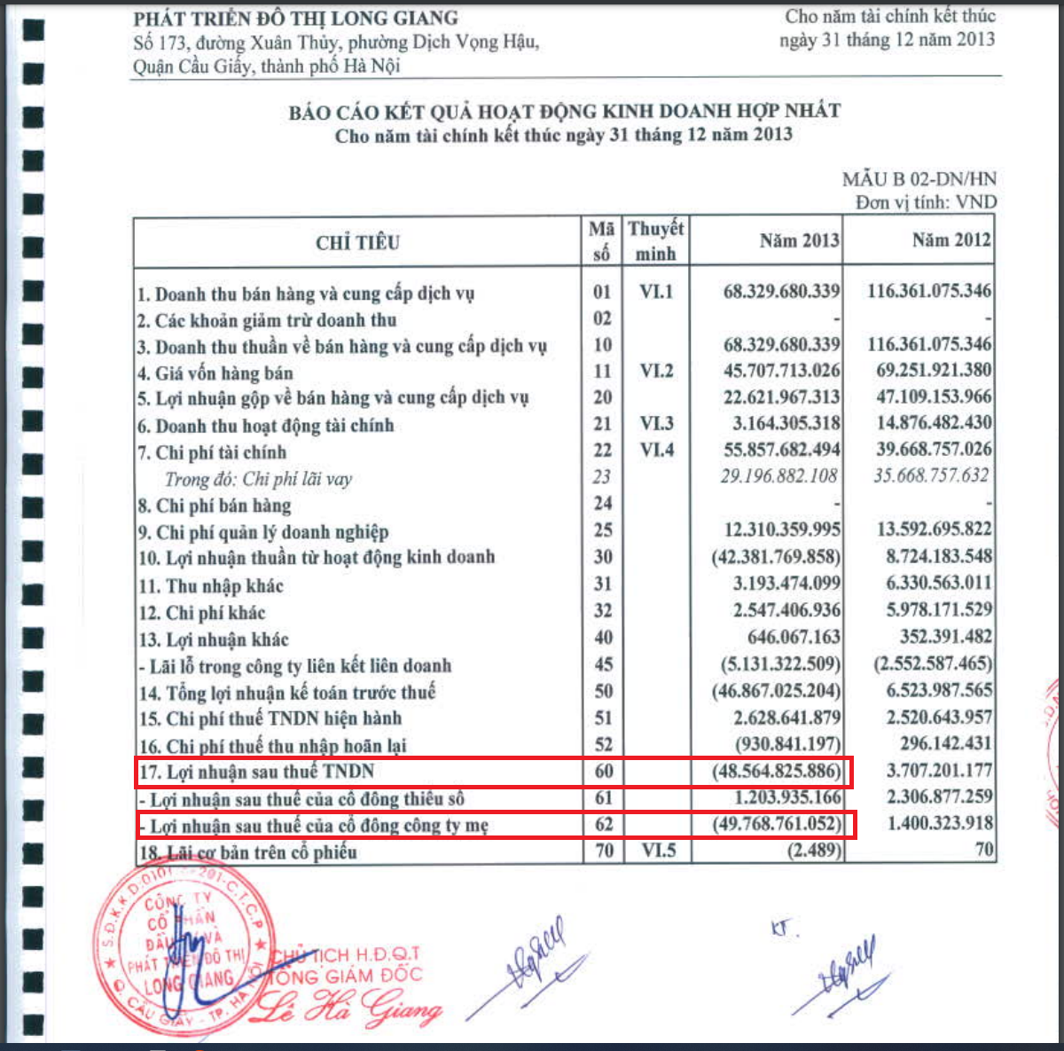 | Cách đây 10 năm, Long Giang Land cũng báo lỗ gần 50 tỷ đồng (Nguồn: BCTC Hợp nhất kiểm toán năm 2013 của LGL). |