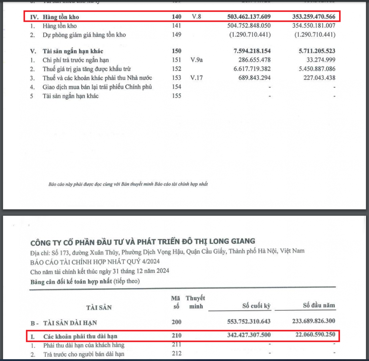 | Tồn kho và khoản phải thu dài hạn của Long Giang Land bất ngờ tăng mạnh trong năm 2024 (Nguồn: BCTC Hợp nhất quý IV/2024 của LGL). |