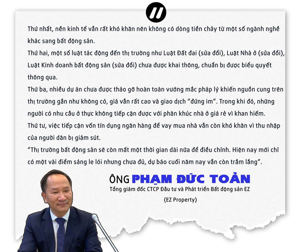 “Thị trường bất động sản hiện nay đã qua cơn bĩ cực nhất, vậy nên mọi thứ sẽ diễn tiến theo hướng tốt lên, vì khó khăn lớn nhất đã đi qua. Tuy nhiên, tốt lên như thế nào và khi nào phục hồi hoàn toàn thì phụ thuộc rất lớn vào đà phục hồi kinh tế nói chung cũng như sự thẩm thấu của các chính sách luật quan trọng đối với lĩnh vực nhà đất như Luật Đầu tư, Luật Doanh nghiệp, Luật Kinh doanh BĐS, Luật Nhà ở sẽ được sửa đổi và thông qua trong cuối năm nay”, ông Chung nhấn mạnh.