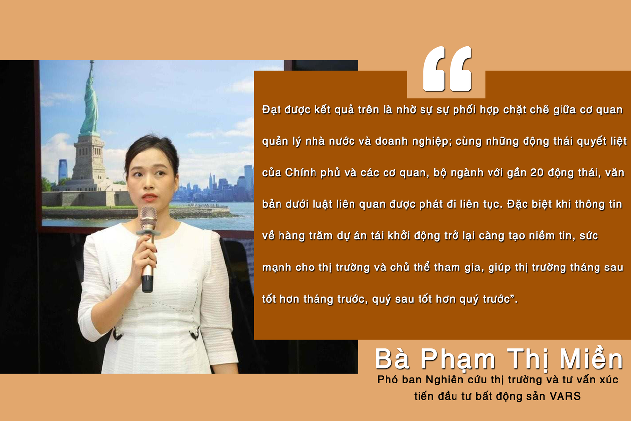 Bà Phạm Thị Miền, Phó ban Nghiên cứu thị trường và tư vấn xúc tiến đầu tư bất động sản VARS cho rằng, trong bức tranh tổng thể của thị trường đã thực sự xuất hiện rất nhiều điểm sáng. Đó là những địa phương có kinh tế phát triển được quan tâm, chú trọng thúc đẩy đầu tư cơ sở hạ tầng, giao thông như: Hà Nội, Hải Phòng, Lào Cai, Đà Nẵng, TP. HCM… Ngoài ra, ngày càng ghi nhận thêm các địa phương sẵn sàng vào cuộc để chung tay gỡ rối cùng doanh nghiệp bất động sản. Đây là tín hiệu đáng mừng và đáng ghi nhận.