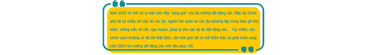 Năm 2023 có thể coi là một năm đầy “sóng gió” của thị trường bất động sản. Mặc dù Chính phủ đã có nhiều chỉ đạo tới các bộ, ngành liên quan và các địa phương tập trung tháo gỡ khó khăn, vướng mắc về vốn, quy hoạch, pháp lý cho các dự án bất động sản… Tuy nhiên, các chính sách thường có độ trễ nhất định, cần thời gian để có thể thẩm thấu và phải bước sang năm 2024 thị trường bất động sản mới dần phục hồi.