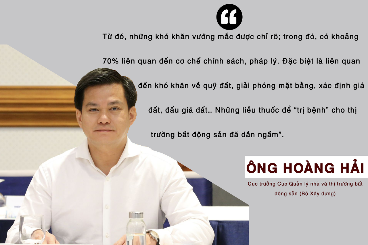 Cục trưởng Cục Quản lý nhà và thị trường bất động sản (Bộ Xây dựng) Hoàng Hải cho biết khác với trước đây, hiện thị trường, doanh nghiệp không chỉ ngồi im chờ hỗ trợ của Chính phủ mà cũng chung tay cùng tháo gỡ. Thời gian qua có rất nhiều cuộc gặp gỡ, làm việc giữa doanh nghiệp với chính quyền địa phương, cơ quan quản lý nhà nước.