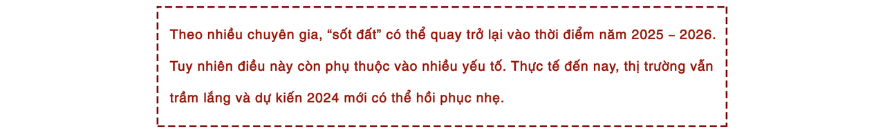 Theo nhiều chuyên gia cho rằng, “sốt đất” có thể quay trở lại vào thời điểm năm 2025 – 2026. Tuy nhiên điều này còn phụ thuộc vào nhiều yếu tố. Thực tế đến nay, thị trường vẫn trầm lắng và dự kiến 2024 mới có thể hồi phục nhẹ.