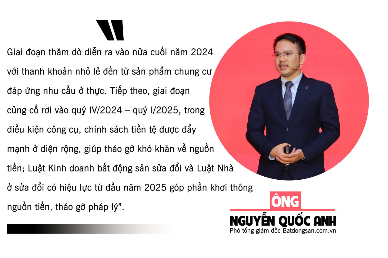 Căn cứ tình hình thực tế, ông Nguyễn Quốc Anh, Phó Tổng Giám đốc Batdongsan.com.vn dự báo: Thị trường bất động sản từ quý 2 - 4/2024 sẽ xuất hiện điểm đảo chiều. Thị trường sau đó mới bước vào chu kỳ mới và trải qua 4 giai đoạn: thăm dò, củng cố, khởi sắc, ổn định.