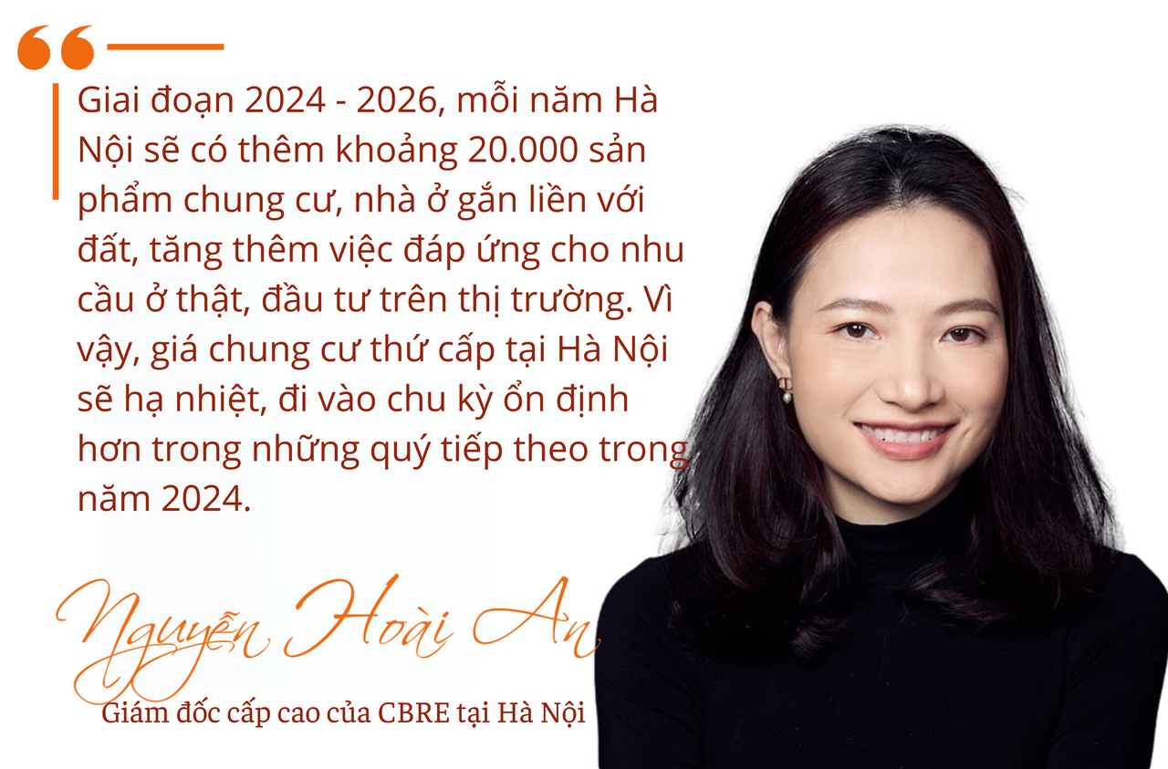 Đánh giá về phân khúc chung cư, bà Nguyễn Hoài An - Giám đốc cấp cao của CBRE tại Hà Nội cho rằng trong thời gian tới nguồn cung nhà sẽ được cải thiện nên giá chung cư tại Hà Nội sẽ không thể tăng "nóng" như thời gian vừa qua.