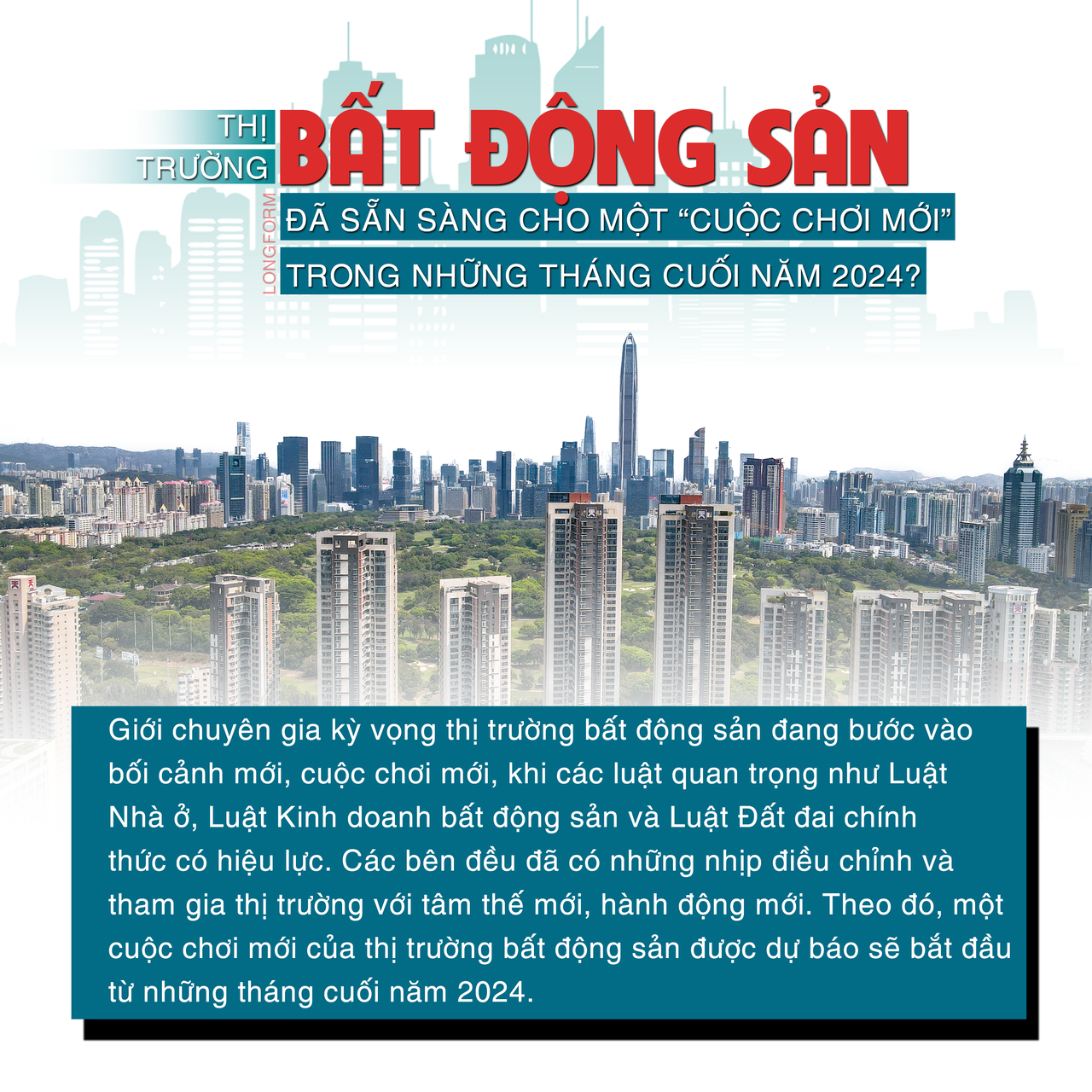 Giới chuyên gia kỳ vọng thị trường bất động sản đang bước vào bối cảnh mới, cuộc chơi mới, khi các luật quan trọng như Luật Nhà ở, Luật Kinh doanh bất động sản và Luật Đất đai chính thức có hiệu lực. Các bên đều đã có những nhịp điều chỉnh và tham gia thị trường với tâm thế mới, hành động mới. Theo đó, một cuộc chơi mới của thị trường bất động sản được dự báo sẽ bắt đầu từ những tháng cuối năm 2024.