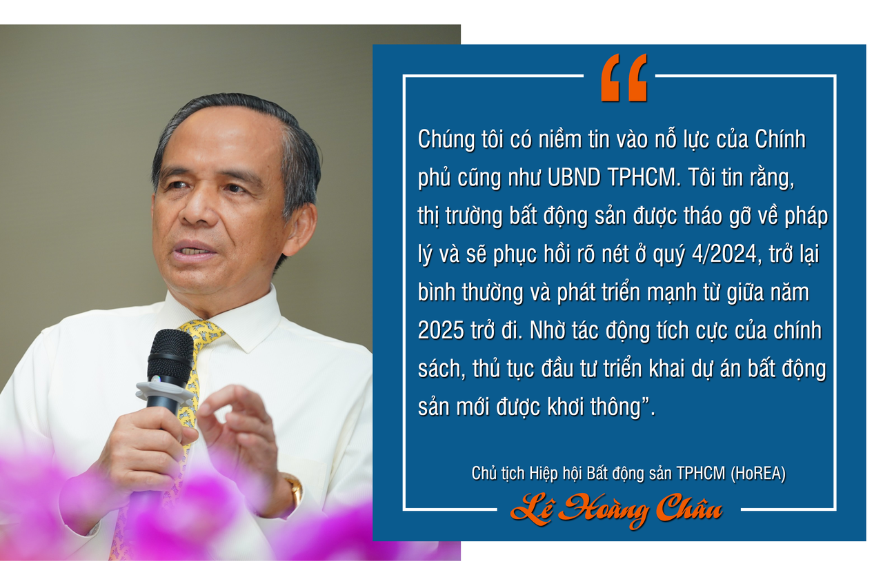 Cũng đồng niềm tin đối với thị trường bất động sản trong thời gian tới, ông Lê Hoàng Châu, Chủ tịch Hiệp hội Bất động sản TPHCM (HoREA) cho biết, từ ở mức tăng trưởng âm vào cuối năm 2023, thị trường bất động sản TPHCM bắt đầu ghi nhận tăng trưởng dương trở lại với kết quả tăng khoảng 6-7% trong 9 tháng năm 2024. Tốc độ phục hồi còn chậm nhưng có xu hướng tháng sau tốt hơn tháng trước, qua đó cho thấy thị trường bắt đầu bước vào giai đoạn phục hồi.