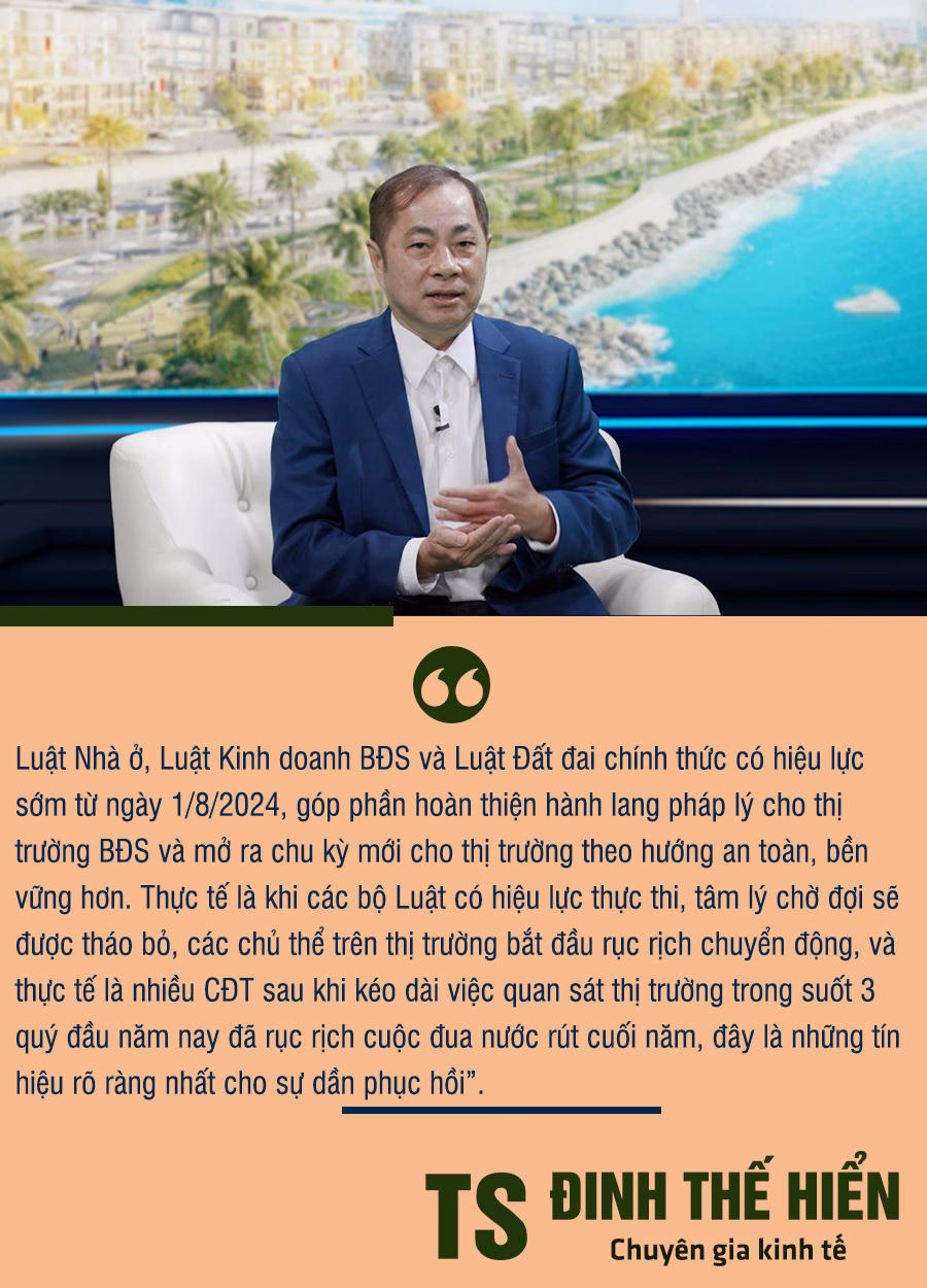 “Luật Nhà ở, Luật Kinh doanh BĐS và Luật Đất đai chính thức có hiệu lực sớm từ ngày 1/8/2024, góp phần hoàn thiện hành lang pháp lý cho thị trường BĐS và mở ra chu kỳ mới cho thị trường theo hướng an toàn, bền vững hơn. Thực tế là khi các bộ Luật có hiệu lực thực thi, tâm lý chờ đợi sẽ được tháo bỏ, các chủ thể trên thị trường bắt đầu rục rịch chuyển động, và thực tế là nhiều CĐT sau khi kéo dài việc quan sát thị trường trong suốt 3 quý đầu năm nay đã rục rịch cuộc đua nước rút cuối năm, đây là những tín hiệu rõ ràng nhất cho sự dần phục hồi”.