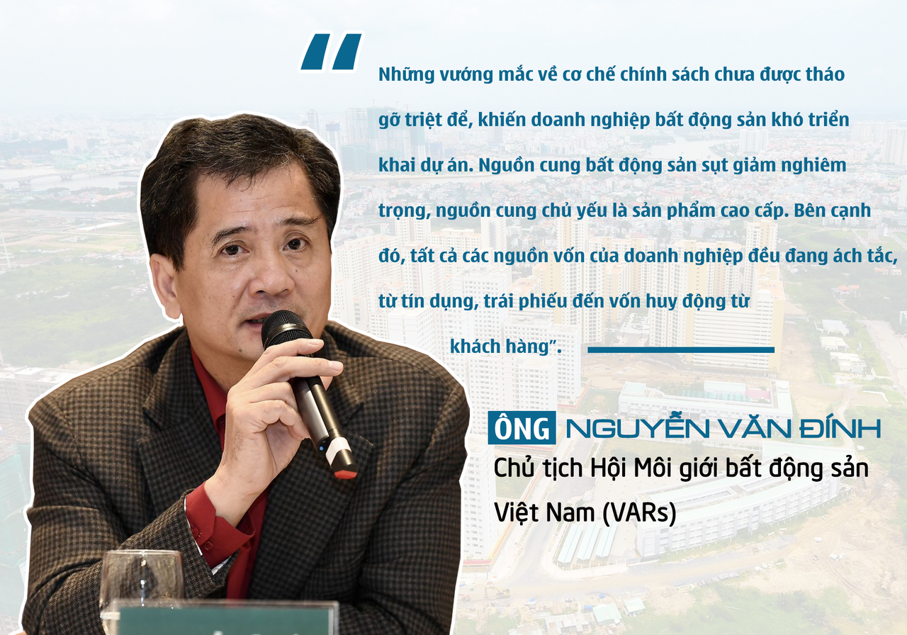 Trong khi đó, theo TS. Lê Xuân Nghĩa, thành viên Hội đồng Tư vấn chính sách tài chính tiền tệ quốc gia, doanh nghiệp bất động sản vẫn đang phải đối diện với những khó khăn về mọi mặt, từ pháp lý, thủ tục đầu tư dự án, đến nguồn vốn, thanh khoản. Ông nhìn nhận nền kinh tế cũng như thị trường bất động sản đang trong trạng thái trì trệ, thanh khoản đóng băng nghiêm trọng ở nhiều ngành, nhiều lĩnh vực.