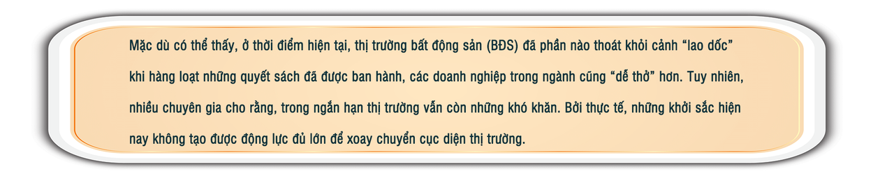 Mặc dù có thể thấy, ở thời điểm hiện tại, thị trường bất động sản (BĐS) đã phần nào thoát khỏi cảnh “lao dốc" khi hàng loạt những quyết sách đã được ban hành, các doanh nghiệp trong ngành cũng "dễ thở" hơn. Tuy nhiên, nhiều chuyên gia cho rằng, trong ngắn hạn, vẫn còn những khó khăn. Bởi thực tế, những khởi sắc hiện nay không tạo được động lực đủ lớn để xoay chuyển cục diện thị trường.