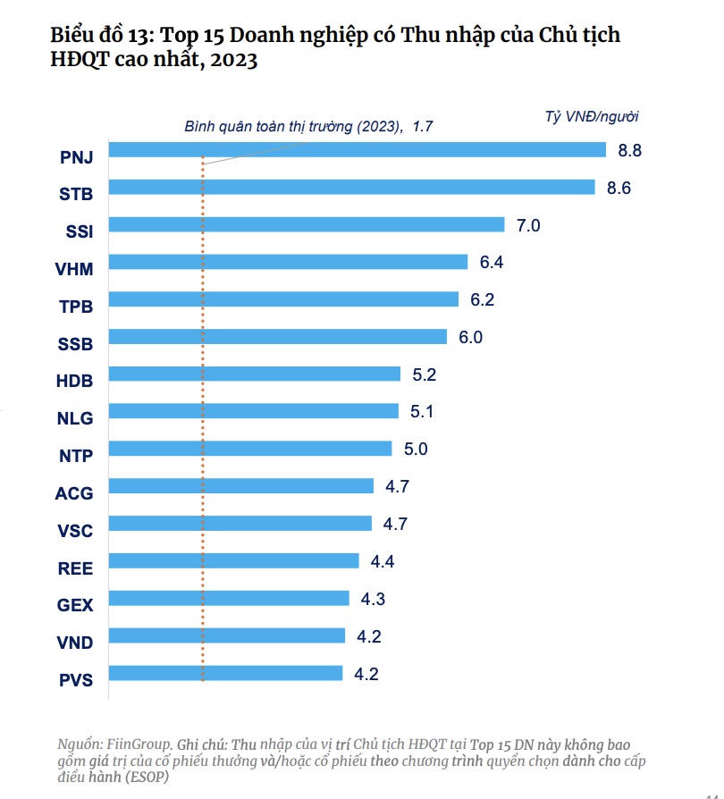 Theo báo cáo "Thu nhập của Tổng Giám đốc, Chủ tịch HĐQT và Thành viên độc lập HĐQT tại các Công ty Đại chúng ở Việt Nam năm 2023", thu nhập bình quân của Chủ tịch HĐQT năm 2023 là 1,7 tỷ đồng/người. Kết quả này được lấy từ dữ liệu của 200 công ty đại chúng trong tổng số 1.647 công ty đại chúng đang niêm yết hoặc đăng ký giao dịch cổ phiếu trên 3 sàn (HOSE, HNX và UPCoM).