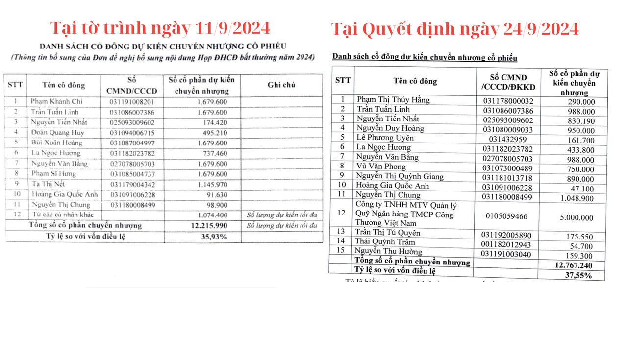 Tuy nhiên danh sách tại tờ trình phê duyệt và Quyết định xuất hiện nhiều tên tuổi mới và tỷ lệ % chuyển nhượng cũng thay đổi.