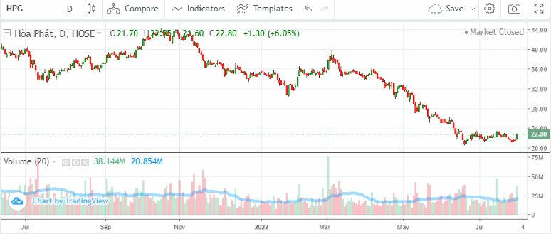 Ngoài ảnh hưởng bởi thị trường chung, câu chuyện doanh nghiệp cũng là lý do khiến thị giá HPG của Tập đoàn Hoà Phát giảm mạnh, mất mốc 30.000 đồng/cổ phiếu để kết thúc phiên giao dịch ngày 1/8/2022, cổ phiếu HPG dừng lại ở mức 22.800 đồng/cp.