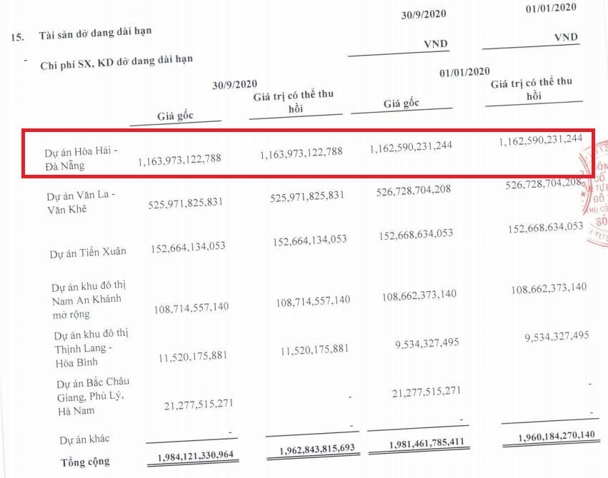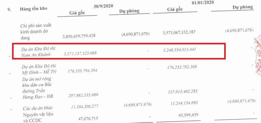 Trong đó, tồn kho chủ yếu nằm ở dự án Khu đô thị Nam An Khánh, tới 3.371 tỷ đồng, chiếm 47% tổng tài sản. Trong khi đó, tồn kho tại dự án khu đô thị mới Mỹ Đình – Mễ Trì là 176 tỷ đồng và dự án mở rộng khu dân cư Bắc đường Trần Hưng Đạo (Hòa Bình) là 298 tỷ đồng.