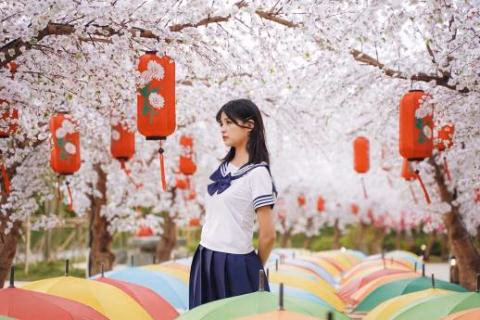 Nữ sinh Nhật Bản với con đường Ô và Hoa anh đào trắng đẹp ngây thơ và tinh khiết