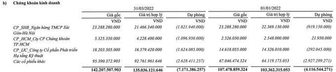 Giai đoạn thứ 2 đến 31/3/2022 vừa qua, kết thúc quý 1/2022, Thép Tiến Lên quyết định tiếp tục đổ tiền vào cổ phiếu IJC nhằm bình quân giá, đồng thời giữ nguyên giá trị đầu tư cổ phiếu SHB, giảm nhẹ tỷ trọng sở hữu cổ phiếu VIX và tăng giá trị đầu tư vào nhóm các cổ phiếu khác lên 95 tỷ đồng. Tổng giá trị gốc chứng khoán kinh doanh tăng lên thành 142,2 tỷ đồng. Tuy vậy tính đến cuối quý 1/2022 Thép Tiến Lên đã nâng số tạm lỗ lên hơn 7 tỷ đồng (trích lập dự phòng 7 tỷ đồng). Song trong kỳ công ty vẫn có khoản lãi bán chứng khoán gần 9 tỷ đồng. Như vậy tạm tính, Thép Tiến Lên có lãi khoảng 2 tỷ đồng nếu “tất toán” khoản đầu tư trong kỳ.