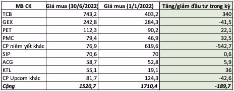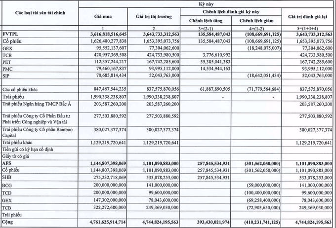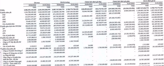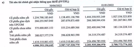 Báo cáo cho biết tổng giá trị tài sản tài chính ghi nhận thông qua lãi/lỗ tính đến 30/6/2022 đã đánh giá lại đạt gần 4.000 tỷ đồng, tương ứng “tạm lỗ” khoảng 100 tỷ đồng.