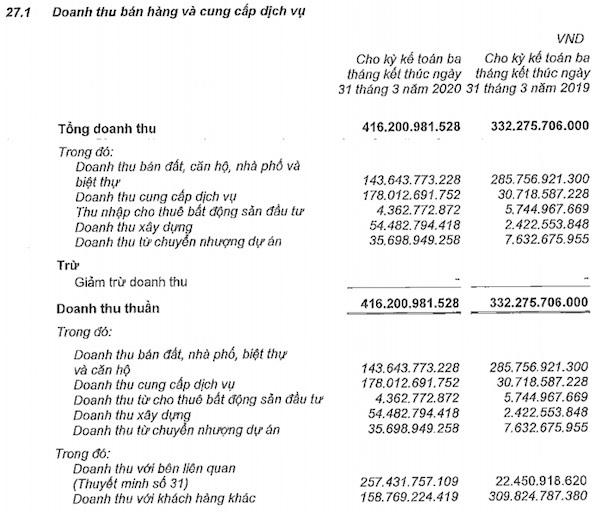 Quý I Nam Long đạt 416 tỷ đồng doanh thu thuần, vẫn ghi nhận tăng trong bối cảnh đại dịch Covid-19 nhờ tăng doanh thu mảng tổng thầu, xây dựng và chuyển nhượng. Tuy nhiên mảng chủ lực là bán đất, căn hộ, nhà phố và biệt thự từng đóng góp tới 86% vào tổng doanh thu quý I/2019 lại giảm mạnh tới 50%.