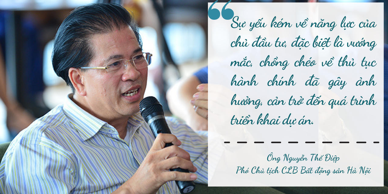 Theo ông Nguyễn Thế Điệp, Phó Chủ tịch Câu lạc bộ Bất động sản Hà Nội cũng đưa ra một lý do về việc triển khai dự án bị chậm: “Sự yếu kém về năng lực của chủ đầu tư, đặc biệt là vướng mắc, chồng chéo về thủ tục hành chính đã gây ảnh hưởng, cản trở đến quá trình triển khai dự án”.