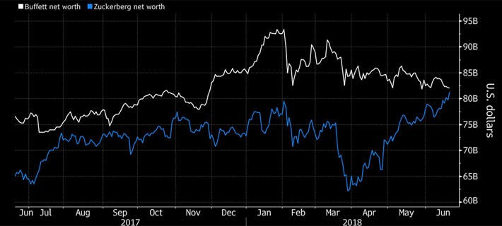 Tính đến ngày thứ Tư, Zuckerberg, người trẻ hơn Buffett trên 50 tuổi, sở hữu khối tài sản ròng 81,6 tỷ USD.