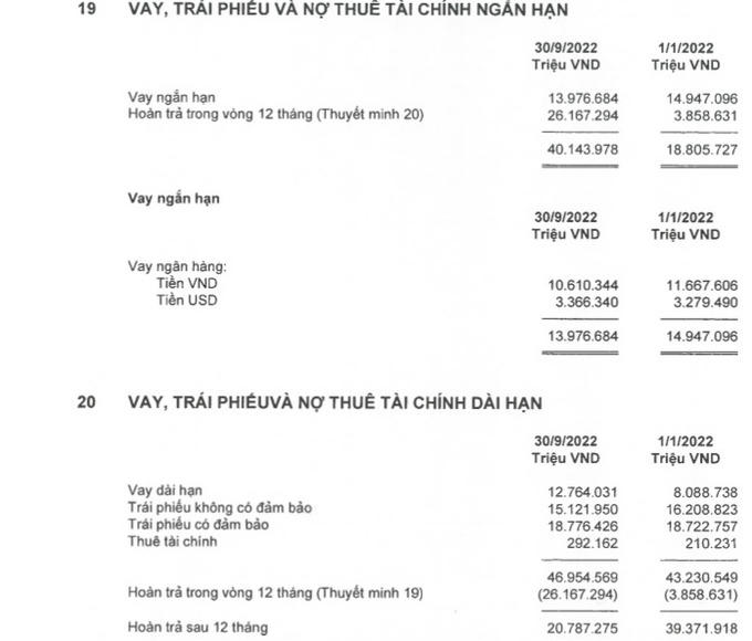 Trong số nợ vay trái phiếu dài hạn có hơn 15.100 tỷ đồng là vay trái phiếu không có tài sản đảm bảo và hơn 18.770 tỷ đồng là vay trái phiếu có tài sản đảm bảo. Áp lực trả nợ thuê tài chính và trả nợ trái phiếu trong ngắn hạn của Masan hơn 40.000 tỷ đồng.
