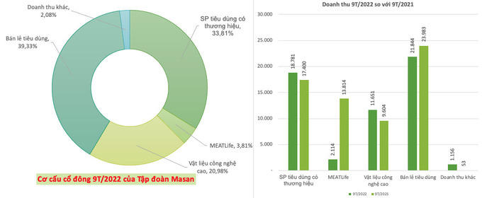 Tính chung 9 tháng đầu năm 2022 doanh thu Masan đạt 55.546 tỷ đồng, giảm 14,3% so với cùng kỳ năm ngoái. Doanh thu tài chính hơn 1.921 tỷ đồng (tăng 1.133 tỷ đồng so với cùng kỳ). Trong đó doanh thu tài chính tăng mạnh một phần nhờ ghi nhận 642 tỷ đồng lãi từ “đánh giá lại giá trị khoản đầu tư trước đây” và “doanh thu tài chính khác” (402 tỷ đồng).