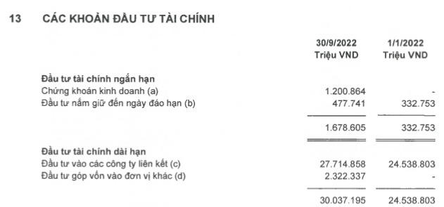 Các khoản đầu tư tài chính dài hạn có đầu tư vào công ty liên doanh liên kết hơn 27.700 tỷ đồng (tăng 3.200 tỷ đồng so với đầu năm) và hơn 2.300 tỷ đồng đầu tư góp vốn vào đơn vị khác.