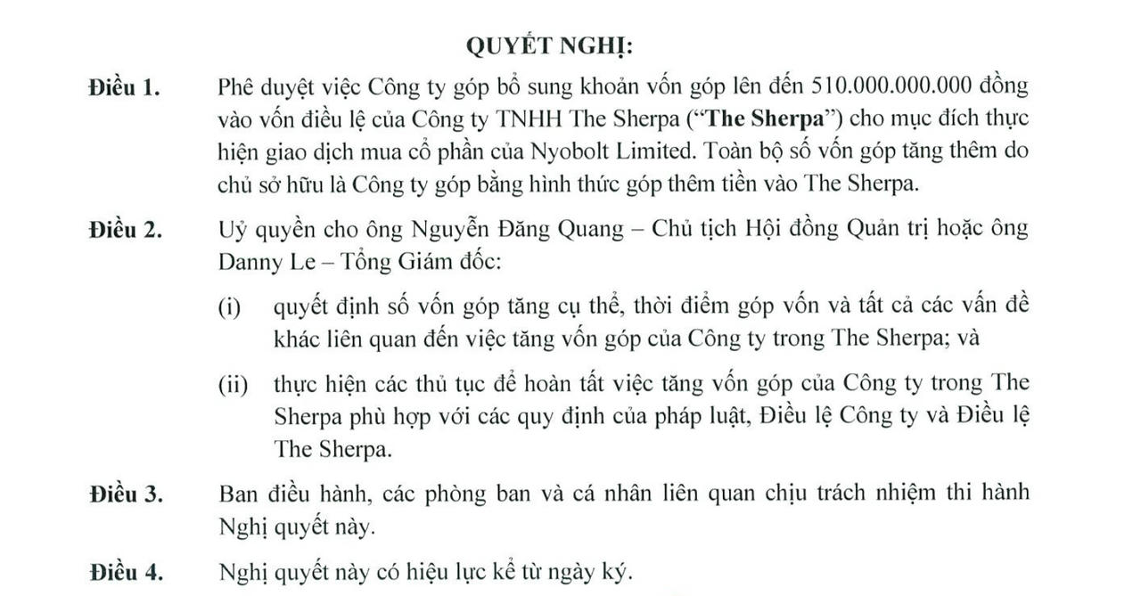 Masan bổ sung 510 tỷ đồng vào vốn điều lệ của Công ty TNHH The Sherpa nhằm mua cổ phần của Nyobolt Limited - công ty chuyên cung cấp giải pháp pin lithium-ion sạc nhanh.Trước đó, Masan đã nắm 21,5% cổ phần của Nyobolt thông qua công ty con Masan High-Tech Materials.