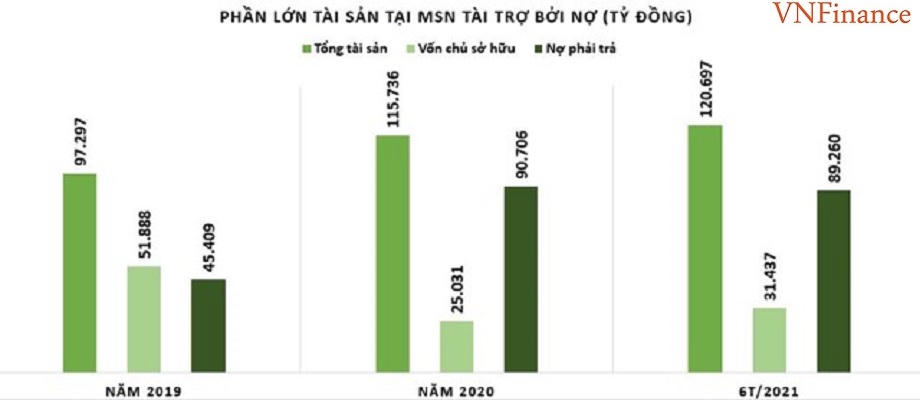 Ngoài ra, nợ phải trả tại MSN đang chiếm tỷ lệ khá cao, giá trị nợ tại thời điểm 31/3/2021 ở mức 89.260 tỷ đồng, con số này đã giảm nhẹ so với đầu năm nhưng vẫn chiếm tới 74% tổng tài sản và lớn gấp hơn 2,8 lần vốn chủ sở hữu (31.437 tỷ đồng). Trong đó, nợ ngắn hạn có giá trị lên tới gần 38.125 tỷ đồng, vượt quá tài sản ngắn hạn của MSN (34.399 tỷ đồng). Yếu tố này ít nhiều ảnh hưởng đến hoạt động của doanh nghiệp.
