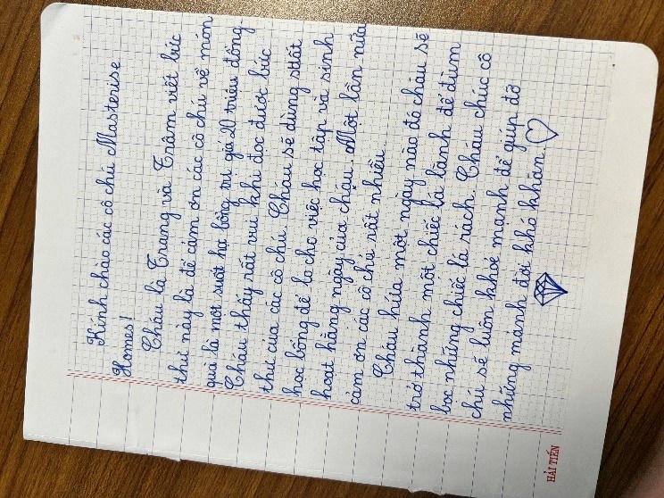 “Chúng tôi ngưỡng mộ những gì các cháu đã làm cho nhau một cách vô tư và cùng nhau vươn lên trong học tập. Cảm ơn Trâm đã giúp Trang vượt qua mặc cảm. Cảm ơn Trang đã mạnh mẽ là tấm gương nghị lực để ngoài kia, những con người gặp khó khăn sẽ có thêm động lực, không bao giờ từ bỏ trước số phận,” trích một đoạn trong lá thư của tập đoàn gửi đến Trang.