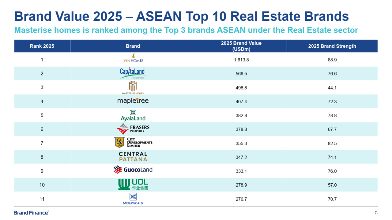 Brand Finance đánh giá Masterise Homes - nhà phát triển bất động sản hàng hiệu đẳng cấp quốc tế - có giá trị thương hiệu đứng thứ 3 trong số các thương hiệu bất động sản giá trị nhất khu vực Đông Nam Á năm 2025.
