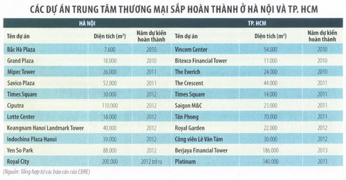 Nhu cầu thuê mặt bằng bán lẻ vẫn tăng khiến các nhà đầu tư không ngần ngại đổ vốn xây thêm các trung tâm thương mại. CBRE ước tính, trong 3 năm tới, tổng diện tích các trung tâm thương mại ở Hà Nội sẽ tăng gấp 5 lần so với hiện tại (đạt khoảng 510.000 m2) và ở TP.HCM sẽ tăng 7 lần (đạt khoảng 740.000 m2).