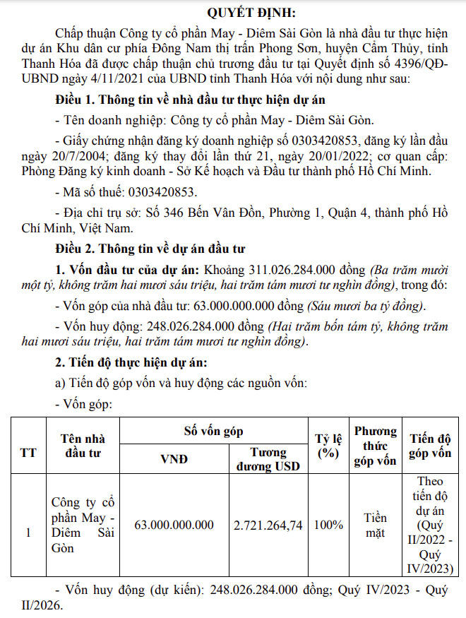 UBND tỉnh Thanh Hóa ngày 18/7/2022 có quyết định số 2488/QĐ-UBND về việc chấp thuận CTCP May - Diêm Sài Gòn là nhà đầu tư thực hiện dự án Khu dân cư phía Đông Nam thị trấn Phong Sơn, huyện Cẩm Thủy. Dự án đã được chấp thuận chủ trương đầu tư tại Quyết định số 4396/QĐUBND ngày 4/11/2021 của UBND tỉnh Thanh Hóa.