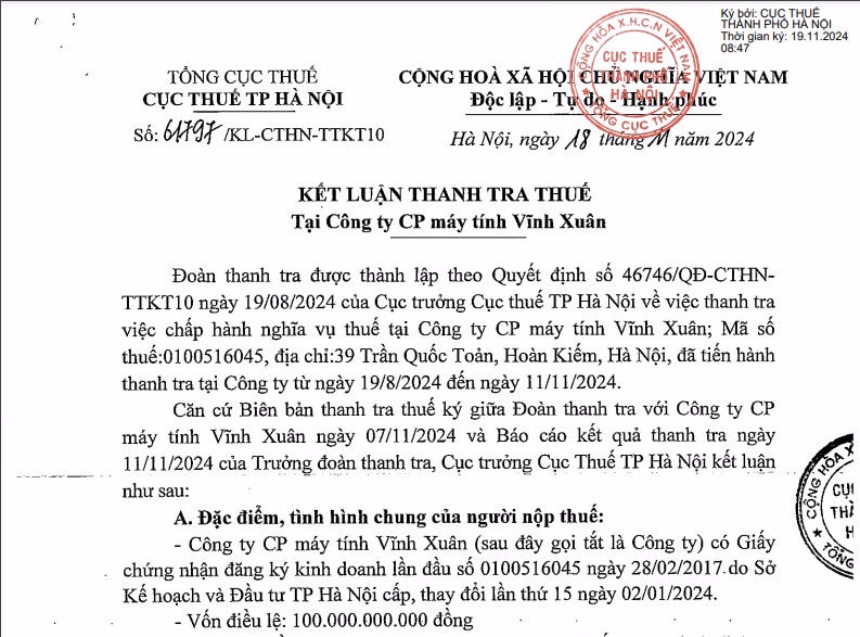 Cục Thuế TP. Hà Nội vừa ban hành kết luận thanh tra thuế tại Công ty cổ phần Máy tính Vĩnh Xuân, trong đó chỉ ra nhiều vi phạm của doanh nghiệp này trong lĩnh vực thuế.