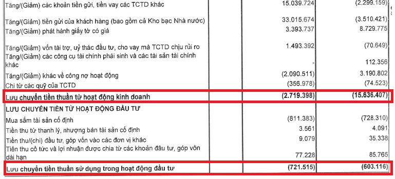 Dòng tiền từ hoạt động kinh doanh âm chủ yếu do tăng các khoản cho vay khách hàng và mua nợ lên hơn 38.133 tỷ đồng trong khi tiền gửi của khách hàng lại chay vào lại 'nhỏ giọt' hơn.