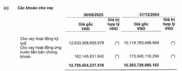 Điểm nhấn nổi bật là dư nợ cho vay ký quỹ và ứng trước tiền bán lên tới 12.796 tỷ đồng – tăng thêm hơn 1.500 tỷ đồng chỉ trong một quý. Riêng dư nợ margin thuần đạt 12.634 tỷ đồng, tăng 12% so với đầu năm và thiết lập mức cao nhất trong lịch sử hoạt động của công ty.