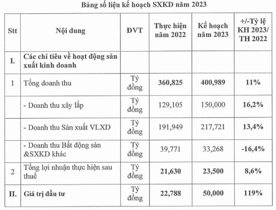 Cụ thể, doanh thu mục tiêu năm 2023 dự kiến đạt 401 tỷ đồng, tăng 11% so với thực hiện năm 2022. Trong đó, lĩnh vực sản xuất vật liệu xây dựng dự kiến đóng góp 54,3% vào tổng doanh thu, ở mức 217,7 tỷ đồng và lĩnh vực xây lắp đóng góp hơn 37,4%, ở mức 150 tỷ đồng. Hai lĩnh vực này dự kiến tăng lần lượt 13,4% và 16,2%.