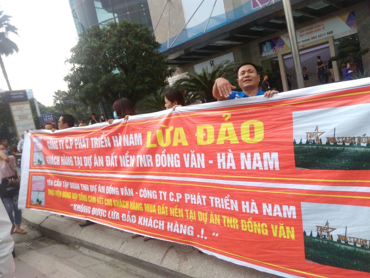 Khách hàng đã nhiều lần tập trung tại dự án cũng như tại các cơ quan chức năng của tỉnh Hà Nam…căng băng rôn (Ảnh: CTV).