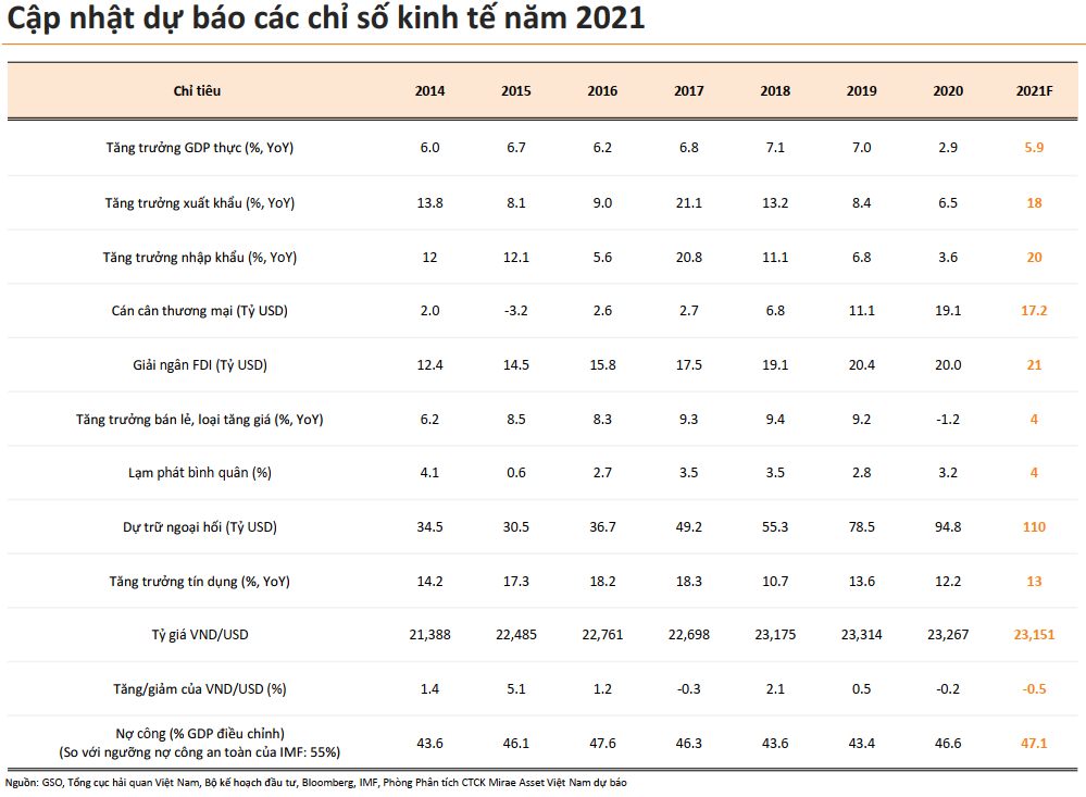 Mirae Asset hạ dự báo tăng trưởng kinh tế Việt Nam trong năm 2021 xuống mức 5,9% trong kịch bản cơ sở, từ mức 6,5% trong dự báo trước đó, do tình hình dịch Covid-19 kéo dài hơn so với kỳ vọng trước đó của Mirae Asset. Đà hồi phục của nền kinh tế phụ thuộc rất lớn vào tốc độ kiểm soát dịch, cũng như tình hình triển khai vắc-xin ở Việt Nam và các nước đối tác của Việt Nam. Mirae Asset cho rằng, các động lực tăng trưởng có thể dần lấy lại đà hồi phục khi dịch được khống chế, bao gồm: 1) Dòng vốn FDI kỳ vọng tăng trưởng trở lại khi dịch được kiểm soát, khi Việt Nam vẫn là điểm đến hấp dẫn của làn sóng FDI toàn cầu; 2) Nhu cầu bên ngoài phục hồi đáng kể nhờ việc triển khai vắc-xin toàn cầu và các gói hỗ trợ kích thích kinh tế ở các đối tác thương mại lớn giúp xuất khẩu tăng trưởng hai con số và thúc đẩy các hoạt động sản xuất công nghiệp trong nước; 3) Chính phủ đẩy mạnh đầu tư công trong các tháng cuối năm 2021 và sang 2022. Điểm tích cực là Chính phủ đã và đang tích cực thực hiện các chính sách tiền tệ và tài khóa hỗ trợ người dân, doanh nghiệp trong mùa dịch và lạm phát và tỷ giá tiếp tục duy trì ổn định.