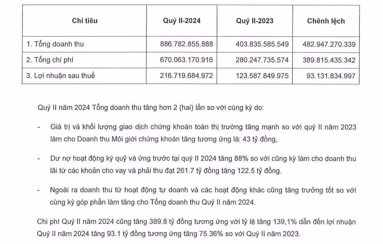 Bên cạnh đó, dư nợ hoạt động ký quỹ và ứng trước tại quý II/2024 tăng trưởng đã đẩy lãi từ các khoản cho vay và phải thu tăng 88% so với cùng kỳ, đạt xấp xỉ 262 tỷ đồng.