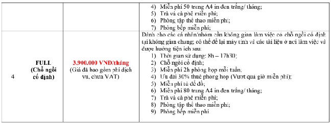 Cụ thể, giá thuê văn phòng chia sẻ tại quận Cầu Giấy, Hà Nội của một doanh nghiệp được chào thuê như sau: Các gói dịch vụ từ Daily (chỗ ngồi theo ngày) có giá từ 120 ngàn đồng, Share (nhóm linh hoạt) có giá 1.900.000 đồng. Còn giá thuê theo tháng dành cho cá nhân/nhóm để cố định có giá là 3.900.000 đồng/tháng.